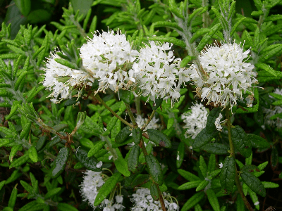 グリーンドイツツツジとも呼ばれる高さ90cmr程度の常緑低木で、春に白い花を付ける。